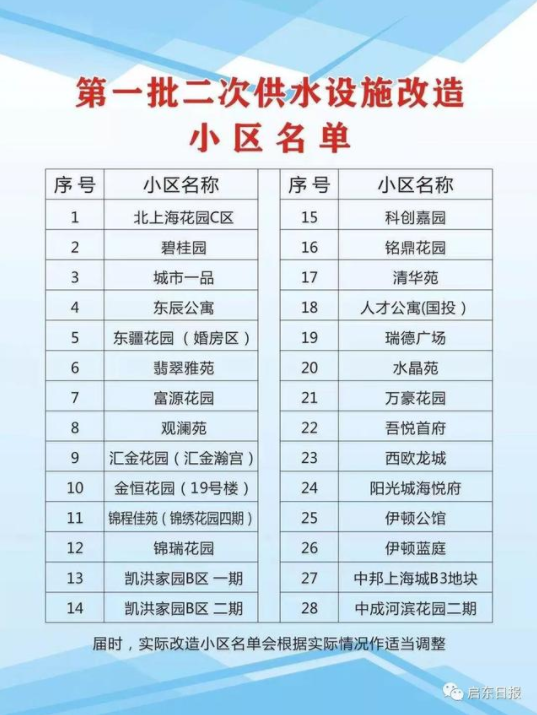 近日,市水务集团公布了城区进入第一批二次供水设施改造的小区名单。这一改造项目将于2月中旬正式实施。